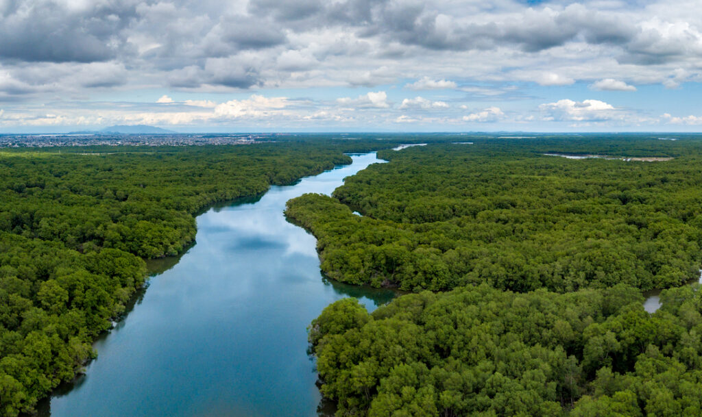 Across the Pacific in South America, a vast mangrove forest stretches along the coast of Ecuador, rooted in waterways between land and sea. These tangled, tropical trees provide critical habitat for 341 threatened species and support roughly one-third of all marine life. Their intricate root systems serve as nurseries and feeding grounds for sharks, rays, dolphins, sea turtles, birds, and more.